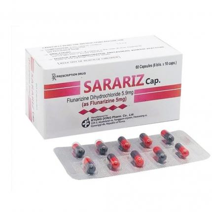 Hoạt chất chính của Sarariz Cap. là Flunarizine – một dẫn xuất của piperazine, thuộc nhóm chẹn kênh canxi. Thuốc có cơ chế đối kháng có chọn lọc dòng Canxi đi qua màng tế bào (não, hồng cầu, cơ mạch máu). Vì vậy, Sarariz Cap. coskhar năng làm giảm tổn thương tế bào do quá tải canxi gây ra, sử dụng trong điều trị và dự phòng cơn đau nửa đầu. Ngoài ra nó cũng có tác dụng kháng Histamine, chống co giật và ức chế tiền đình.